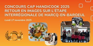 Grand concours national culinaire à destination des personnes en situation de handicap Cap Handicook édition 2025 avec la cinquième étape interrégionale Nord-Est qui s’est tenue à Marcq-en-Baroeul dans les locaux de Cuisine Mode d'Emploi, le 17 novembre avec la participation de 4 équipes composées de candidats Cap emploi - France travail et de candidats d’Esat.