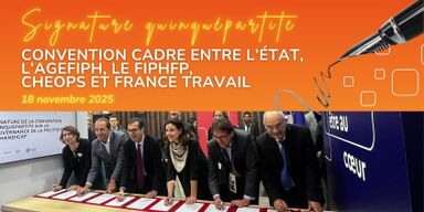 Durant le salon des maires qui se tient à Paris du 18 au 20 novembre, l'Etat, l'Agefiph, le Fiphfp, France Travail et Cheops ont signé une nouvelle convention quinquépartite pour 3 ans (2026-2028)