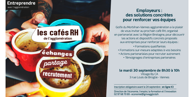 Vous êtes employeur ? En cette rentrée, participez au prochain café RH organisé en partenariat avec la Région Bretagne et Golfe du Morbihan-Vannes Agglomération, le mardi 30 septembre.