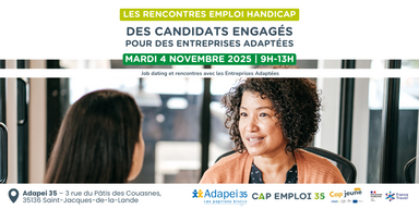 Le mardi 4 novembre 2025, de 9h à 13h, se tiendront les Rencontres de l’Emploi Handicap à l’Adapei 35 (3 rue du Pâtis des Couasnes, Saint-Jacques-de-la-Lande). Un job dating unique dédié à la rencontre entre candidats en situation de handicap et employeurs engagés du territoire.