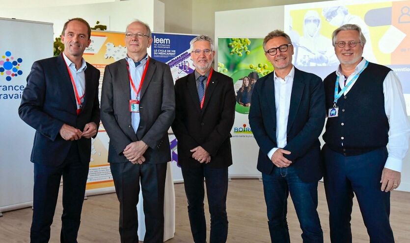 Thibaut GUILLUY Directeur général France Travail, Thierry HULOT Président LEEM, André FARRUGIA Président CHEOPS ARA, Pascal HOUDAYER CEO Boiron, et Thierry BOIRON Président Boiron Développement et DG Délégué Laboratoires Boiron.